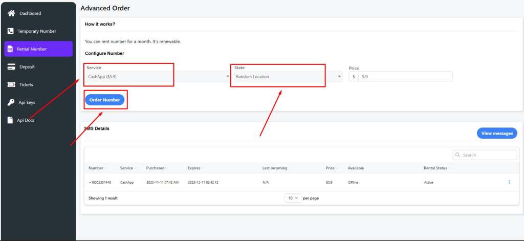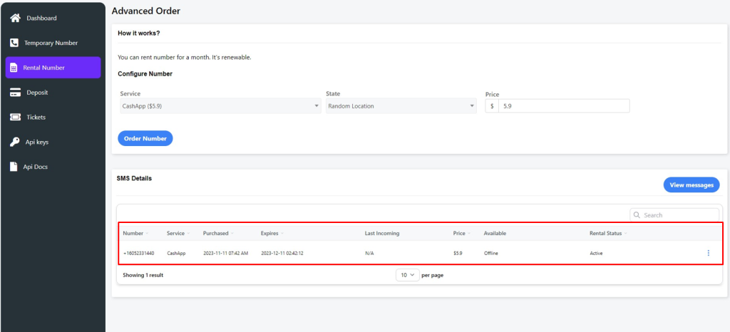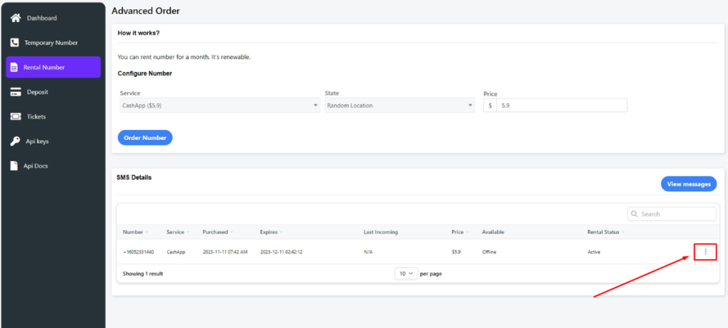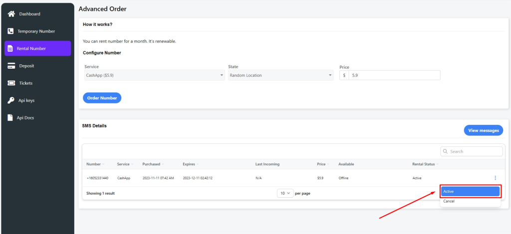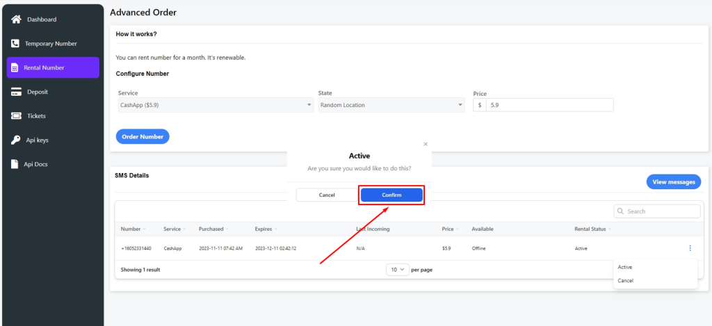 Step 04: If You Clicked Order Number then your rental number will show below, but it will remain inactive, you need to activate it. To active, you have to click on the 3dot on the right of the number you received. Then click on active, and click confirm. Now your number is activated. And You Can Use This Number.